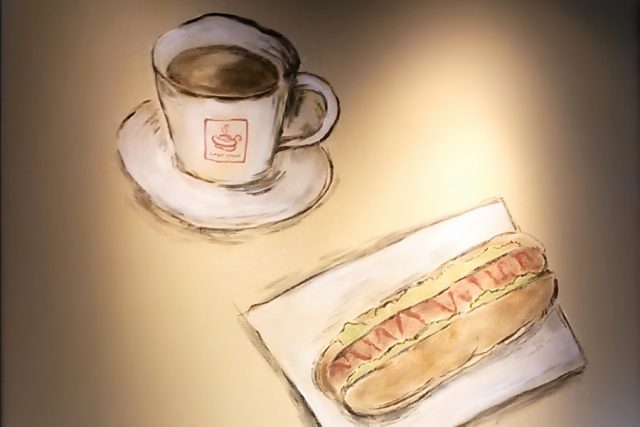 喫茶店の壁にイラスト描きです。 いただいた元絵は個人的にも好みの絵柄でしたので、 心地