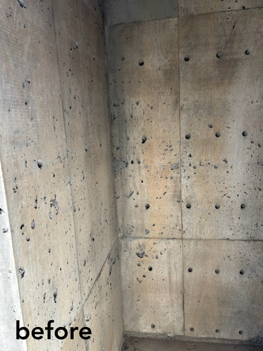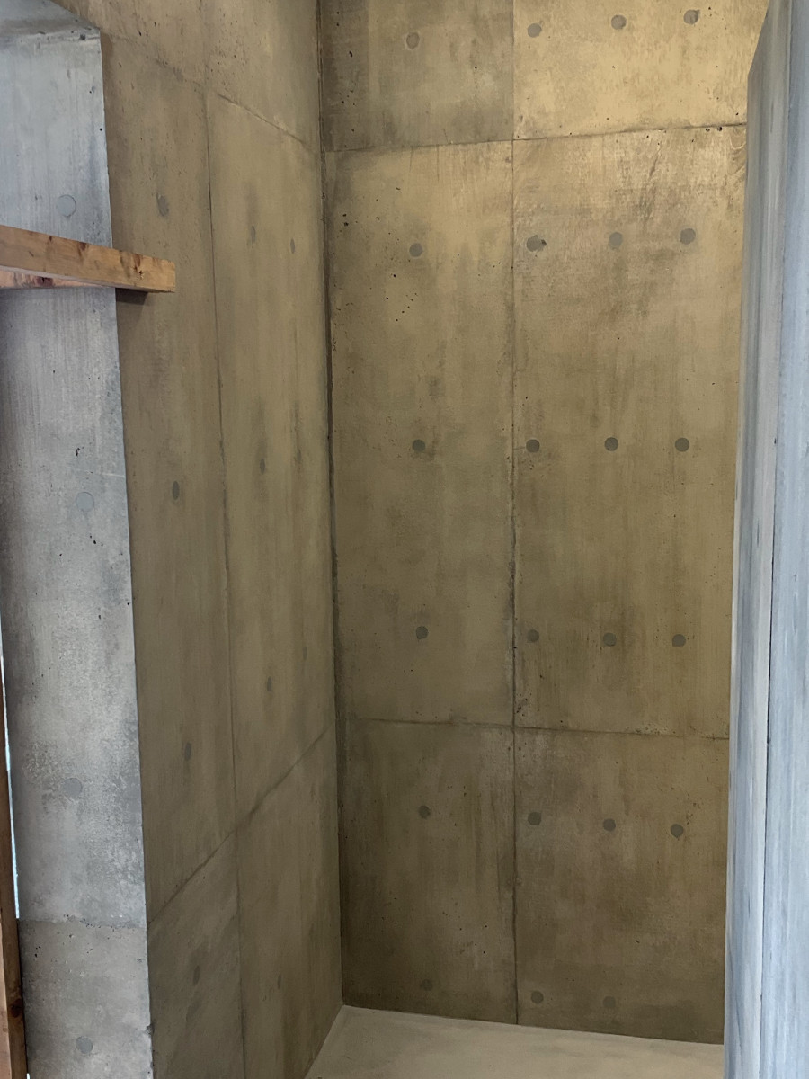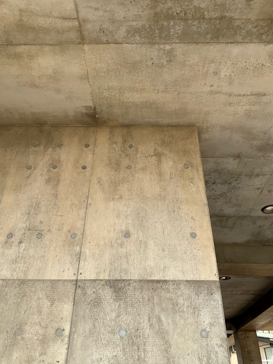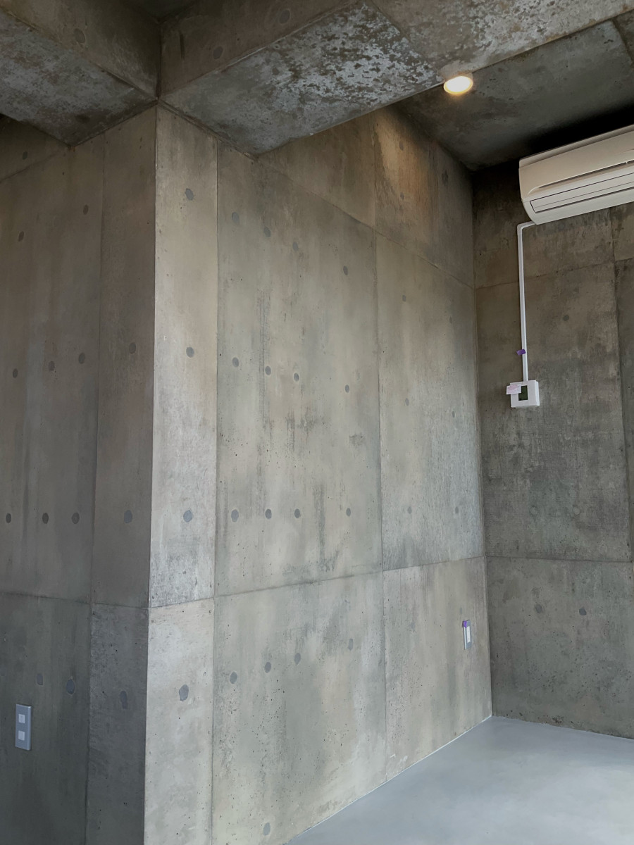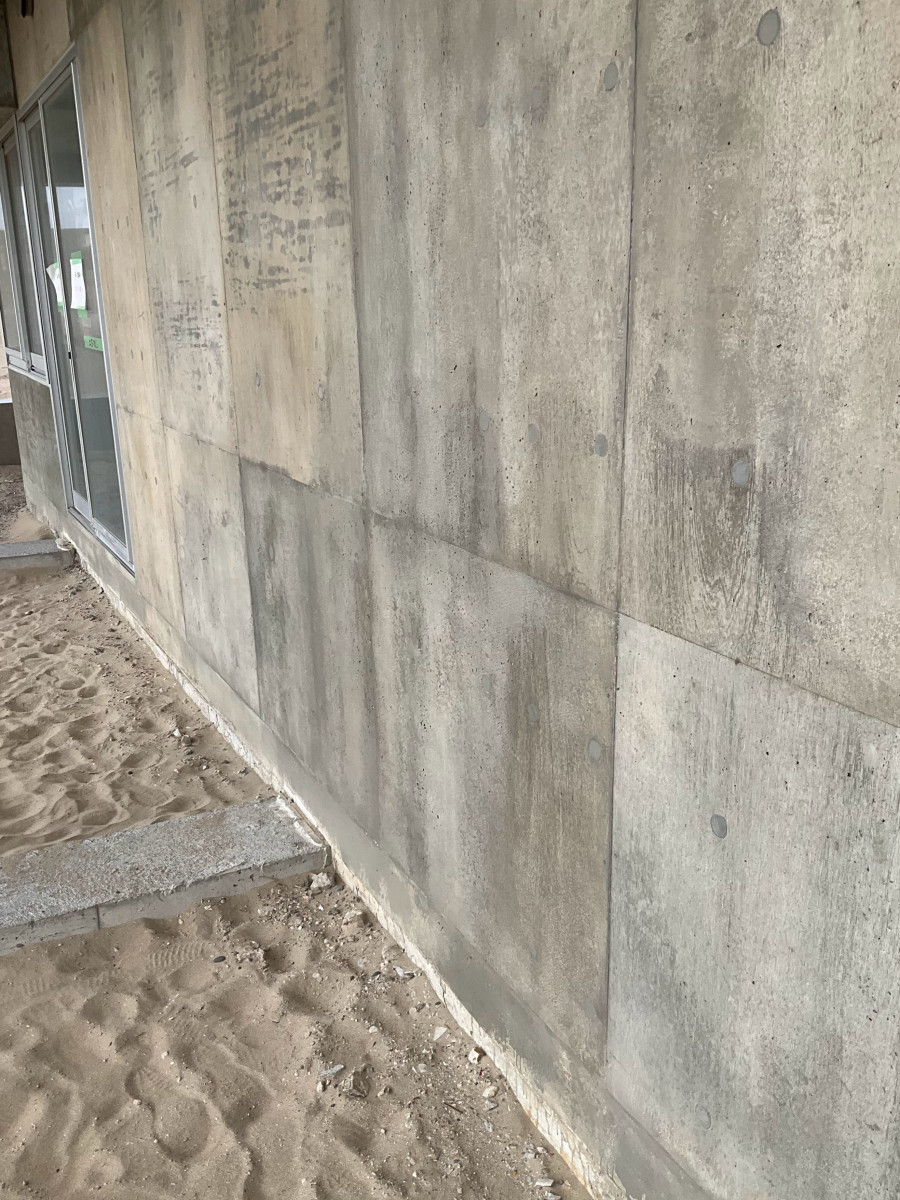コンパネのラワン素地を活かした打ち放しの補修です。 2026/03/19 コンパネのラワン素地を活かした打ち放しの補修です。 総面積500㎡の7割ほどに手を入れました。 セメントの表面は木の色味が写ったうえにバサバサの質感で、ジャンカやピンポールもかなり多く通常の打ち放し補修とは別物です。 工期は真冬、そして海岸。 歩く度に砂地に足を取られ、時に砂嵐に見舞われるという厳しい環境での作業となりました。 ここまで大変な現場はなかなかありませんが、 寒さに震えながらも自然の中にいることで気持ちが整ったせいか、意外にも楽しむことができました。 皆さまありがとうございました。