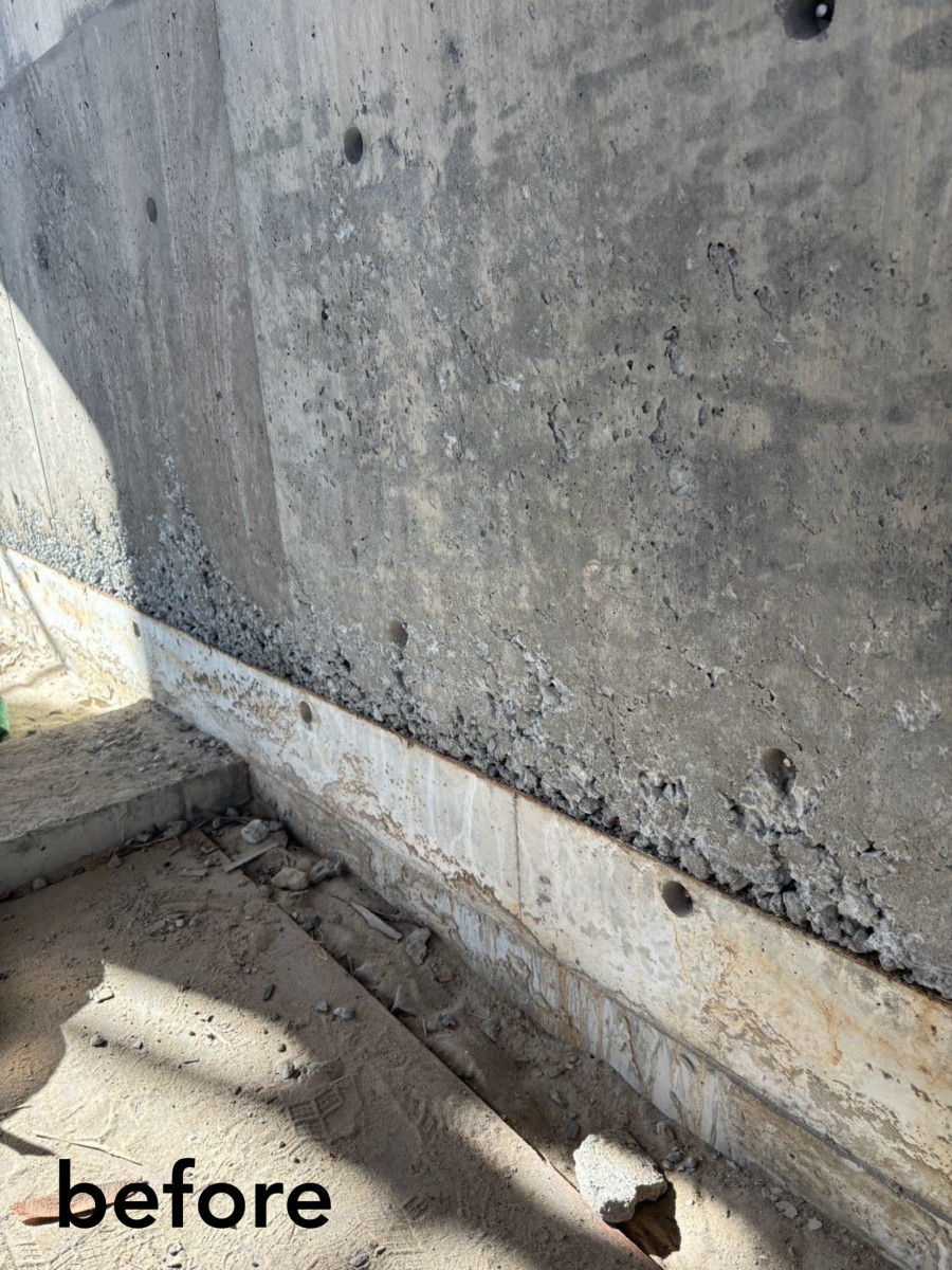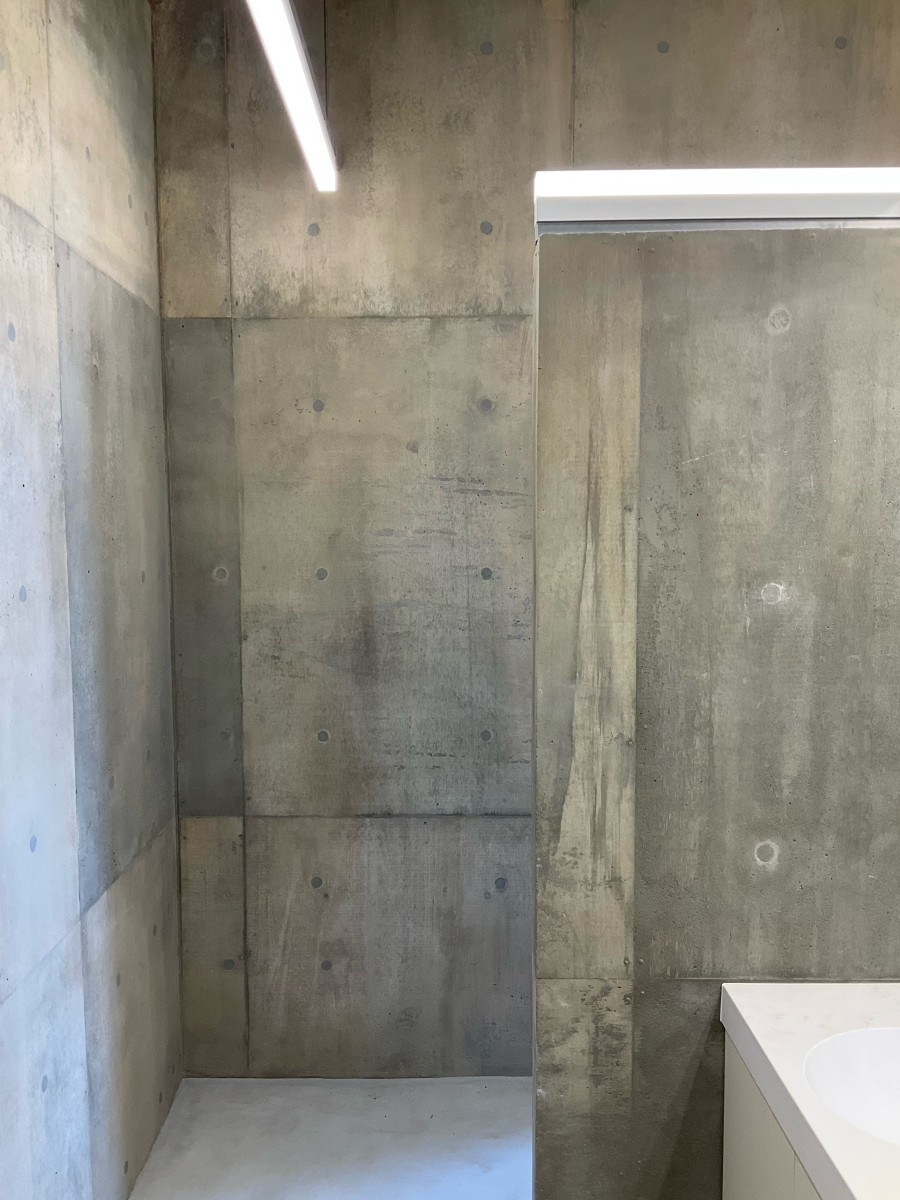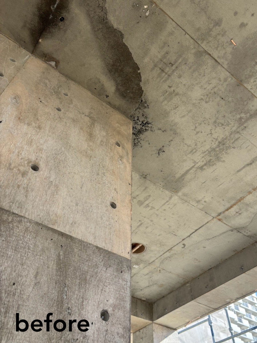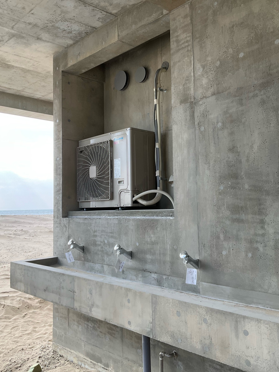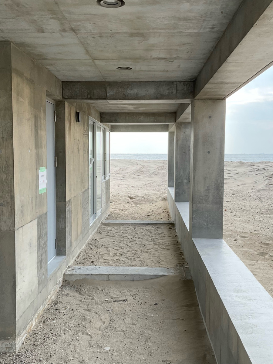コンパネのラワン素地を活かした打ち放しの補修です。 2026/03/19 コンパネのラワン素地を活かした打ち放しの補修です。 総面積500㎡の7割ほどに手を入れました。 セメントの表面は木の色味が写ったうえにバサバサの質感で、ジャンカやピンポールもかなり多く通常の打ち放し補修とは別物です。 工期は真冬、そして海岸。 歩く度に砂地に足を取られ、時に砂嵐に見舞われるという厳しい環境での作業となりました。 ここまで大変な現場はなかなかありませんが、 寒さに震えながらも自然の中にいることで気持ちが整ったせいか、意外にも楽しむことができました。 皆さまありがとうございました。